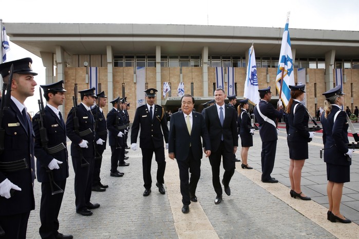 문 의장은 “대한민국 국회의장 최초로 이스라엘을 공식 방문해 기쁘다”며 환영식에 대한 감사를 전한 뒤, “한국과 이스라엘은 민주화와 경제성장을 동시에 달성했다는 점, 그리고 양국 모두 지하자원은 부족하나 높은 교육열과 근면으로 이를 극복했다는 점이 유사하다”고 말했다.