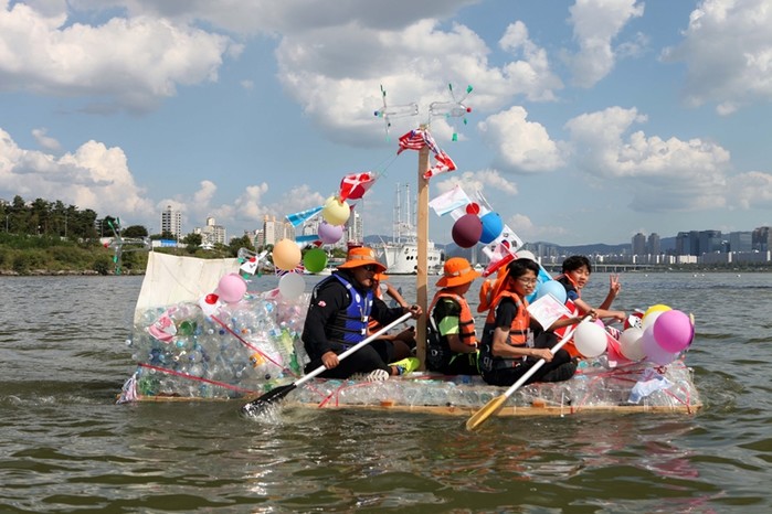 고명중학교 학생들이 제2회 플라스틱병뗏목만들기 행사에서 직접 만든 뗏목을 타고 즐거워하고 있다.