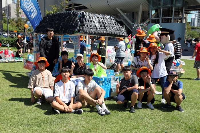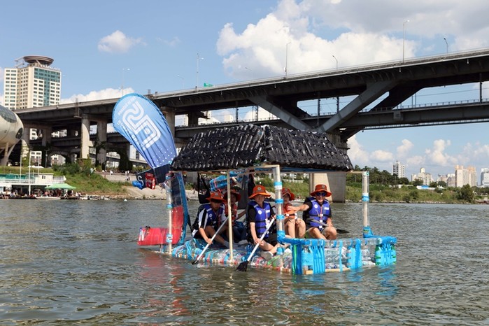 동도중학교 학생들이 제2회 플라스틱병뗏목만들기 행사에서 직접 만든 뗏목을 타고 즐거워하고 있다.