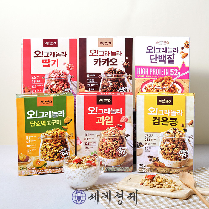 마켓오 네이처 오!그래놀라는 바쁜 현대인들이 시간과 장소의 제약 없이 간편하게 한 끼 식사를 할 수 있도록 선보인 간편대용식 제품. 이번 리뉴얼 된 6종 외에도 오!그래놀라팝 2종(팝 크랜베리 아몬드, 팝 초코아몬드), 오!그래놀라 콜라보 2종(초코고래밥, 다이제) 등 총 10종과 ‘오!그래놀라바’ 4종(검은콩, 무화과베리, 단호박고구마, 카카오&유산균볼)을 판매 중이다. 오!그래놀라 10종의 올해 1~9월 매출은 지난해 같은 기간 대비 약 114% 성장했다. 지난 4월부터는 6개월 연속 월 매출 10억 원을 넘어서며 그래놀라 시장의 확대를 이끌고 있다.