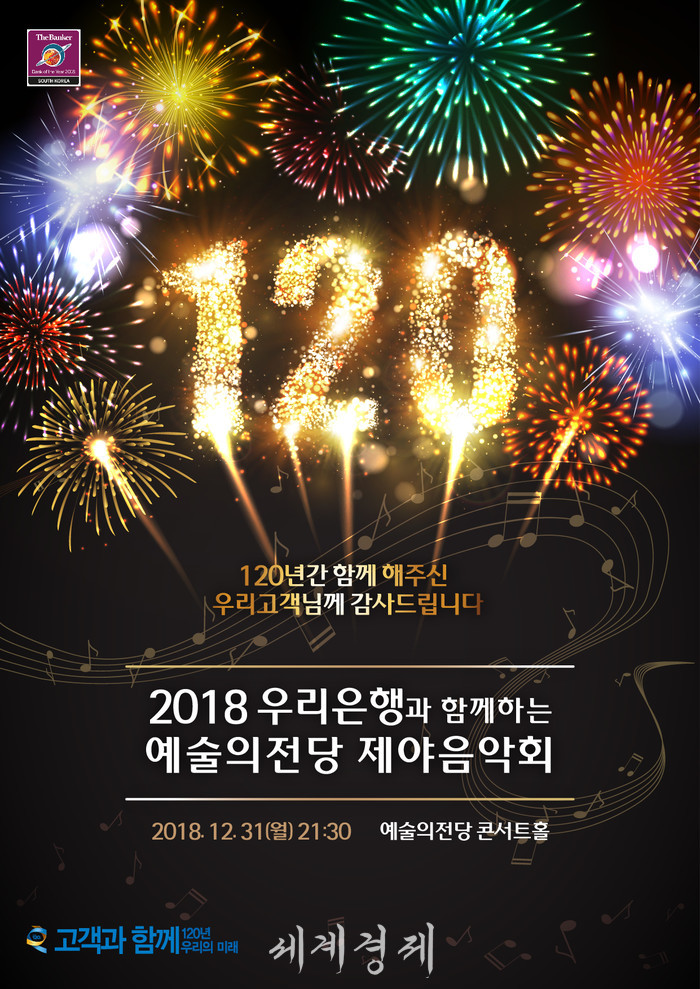 우리은행은 문화예술 지원활동의 하나로 2008년부터 11년째 예술의전당 제야음악회를 후원하고 있다. 제야음악회는 한해를 마무리하고 다가올 새해를 맞이한다는 의미에서 매년 마지막 날에 실시되고 있으며, 음악회에 이어 예술의전당 야외광장에서는 소망풍선 날리기와 불꽃놀이 등 2019년 새해맞이 행사가 진행될 예정이다.
