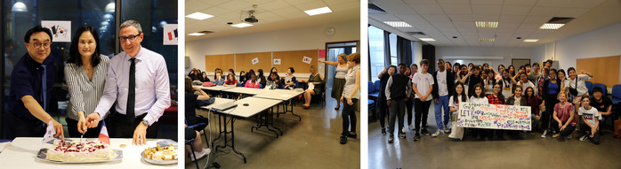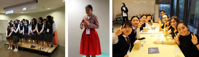 | ▲ 왼쪽부터 상제리제를 합창하고 있는 동도중학교 학생들, 한복을 입고 단소로 아이랑을 연주하는 이희애 학생, 자매학교학생들과 이야기를 나누고 있는 모습 <사진제공 : 동도중학교> |