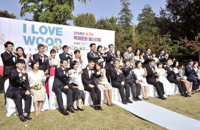 ▲ 용산가족공원에서 펼쳐진 제2회 목재문화 페스티벌에서 제6회 목혼식에 참여한 부부들이 기념촬영을 하고 있다. <사진제공:산림청> |