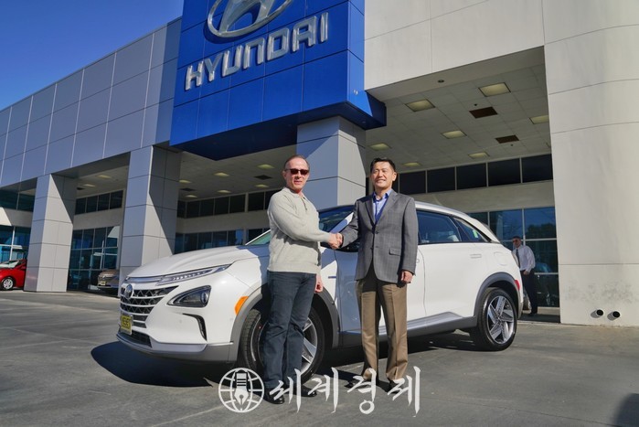 [세계경제]김효숙 기자= 현대자동차가 현지시간 28일 오후 미국 캘리포니아 배너이(Van Nuys)에 위치한 딜러점 ‘키이스 현대(Keyes Hyundai)’에서 수소전기차 ‘넥쏘(NEXO)’의 미국 첫 고객 차량 전달식을 가졌다고 30일 밝혔다.