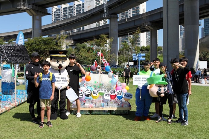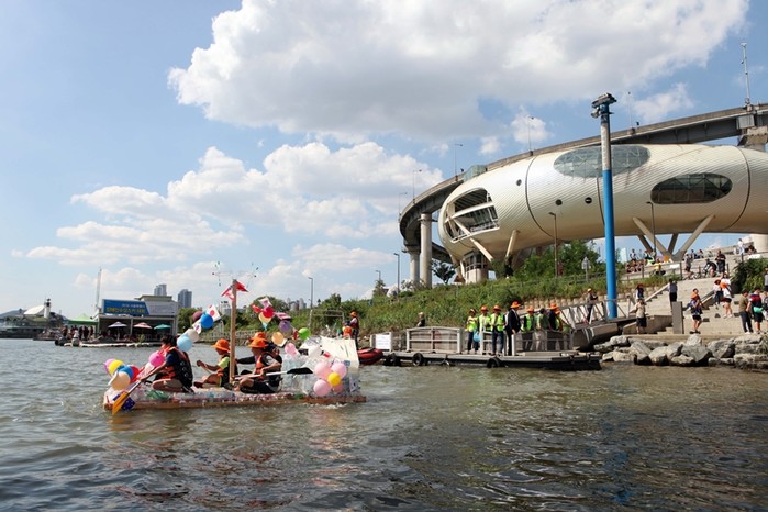 고명중학교 학생들이 제2회 플라스틱병뗏목만들기 행사에서 직접 만든 뗏목을 타고 즐거워하고 있다.