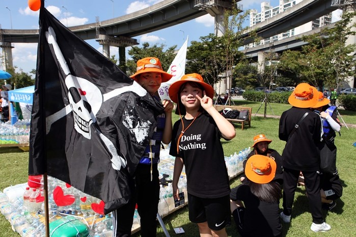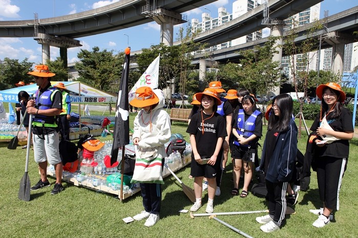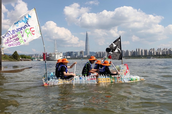 명일여자고등학교 학생들이 제2회 플라스틱병뗏목만들기 행사에서 직접 만든 뗏목을 타고 즐거워하고 있다.