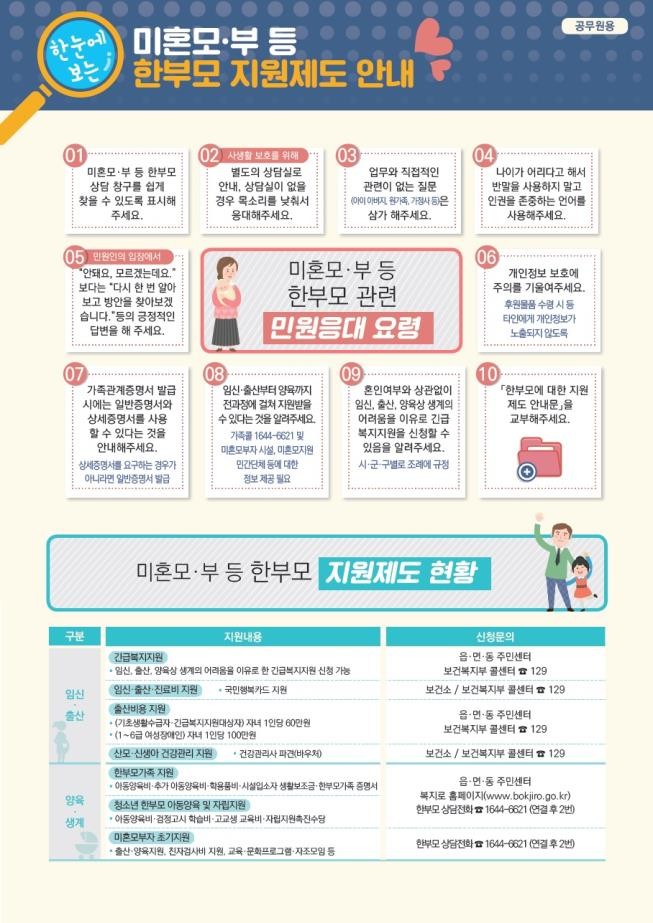 여성가족부는 해당 시설 정원의 10% 이내에서는 소득수준과 관계없이 입소할 수 있도록 미혼모 지원시설에 입소 기준을 대폭완화하고, 한부모가족 미원 10가지 응대수칙과 한 눈에 보는 지원제도 안내문을 마련 전국 주민센터에 배포했다.