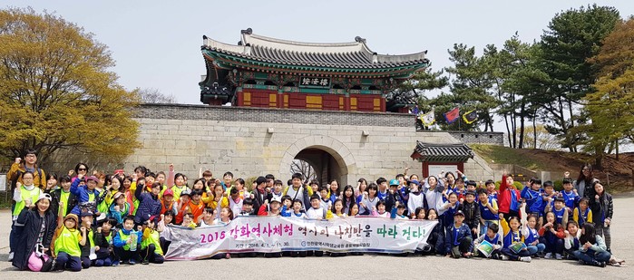 | ▲인천영종초등학교 4학년 학생들이 강화역사체험에서 기념사진을 찍고 있다. <사진제공 : 인천학생교육원> |