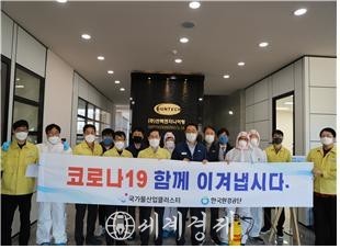 사업단 2명과 미화·관리업체 4명으로 구성하였으며, 질병관리본부가 배포한 「신종 코로나바이러스감염증 감염예방 집단시설·다중이용시설 소독 안내('20.2.13.)」에 명시된 소독원칙, 방법, 승인 소독제품 등을 적용하여 방역입주기업에게 마스크 150장과 손소독제 150개를 전달하는 등 입주기업 임직원의 건강관리에도 도움을 주고 있으며 열화상카메라를 통한 확인, 마스크 착용 독려 및 비치 등 코로나19의 확산 방지를 위해 적극적으로 대처하고 있다.